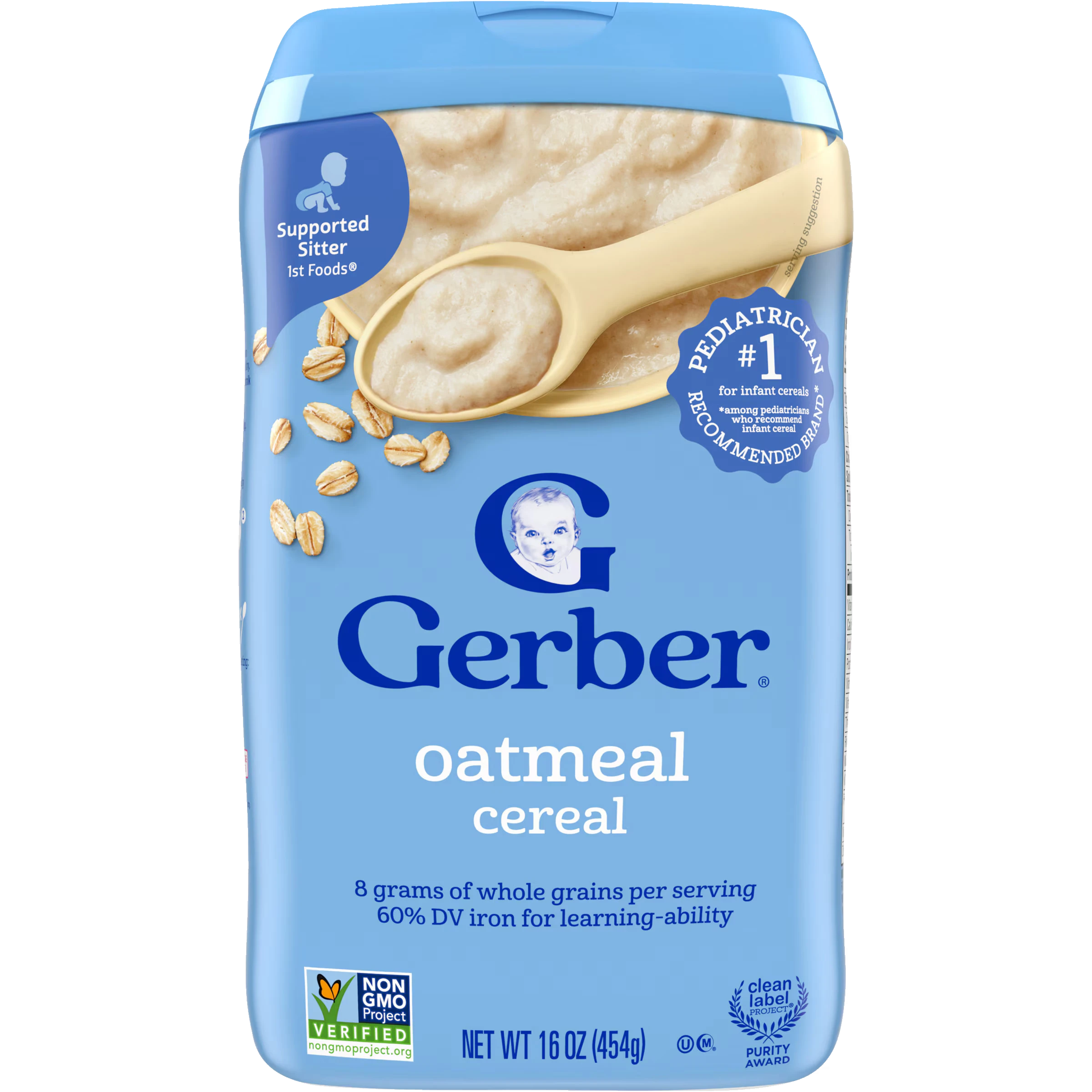 When your baby is ready to start solids, try Gerber Oatmeal cereal. It also has iron to help support learning ability as well as Calcium, Vitamins C and 6 B Vitamins for healthy growth. 16 ounce container, about 30 servings per container Has iron for healthy brain development Non-GMO: not made with genetically engineered ingredients Made with whole grains Gerber is a leader in infant and early childhood nutrition. Ingredients: Ingredients: Whole Grain Oat Flour and Oat Flour (Contains Wheat), Potassium Phosphate,Vitamins and Minerals: Calcium Carbonate, Vitamin C (Ascorbic Acid), Iron (Electrolytic), Zinc Sulfate, Vitamin E (Alpha Tocopheryl Acetate), Niacinamide, Vitamin B2 (Riboflavin), Vitamin B1 (Thiamin Mononitrate), Vitamin B6 (Pyridoxine Hydrochloride), Vitamin B12, Folic Acid. Directions: Instructions: Twist cap off, remove seal & twist back on. Completely cooked and ready to serve.Just add liquid.
